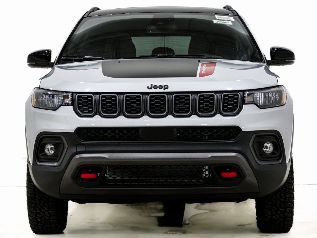 Price excludes tax, title, license, doc fee and dealer installed accessories. Price includes: $1000 - 2026 National Retail Bonus Cash . Exp. 03/02/2026 $2000 - 2026 National Select Inventory Bonus Cash. Exp. 03/02/2026 2026 Jeep Compass Trailhawk 4WD Silver Zynith Metallic Clearcoat 2.0L I4 DOHC 4WD, 10.1" Touchscreen Display, 4-Wheel Disc Brakes, 4.398 Final Drive Ratio, 4G LTE Wi-Fi Hot Spot, 6 Speakers, ABS brakes, Air Conditioning, Alexa Built-In, Alloy wheels, AM/FM radio: SiriusXM, Auto High-beam Headlights, Auto-dimming Rear-View mirror, Automatic temperature control, Brake assist, Bumpers: body-color, Cluster 10.25" TFT Color Display, Compass, Connected Travel and Traffic Services, Delay-off headlights, Driver door bin, Driver vanity mirror, Dual front impact airbags, Dual front side impact airbags, Electronic Stability Control, Emergency communication system: SiriusXM Guardian, Four wheel independent suspension, Front anti-roll bar, Front Bucket Seats, Front Center Armrest w/Storage, Front dual zone A/C, Front fog lights, Front License Plate Bracket, Front reading lights, Fully automatic headlights, Global Telematics Box Module, GPS Navigation, HD Radio, Heated door mirrors, Heated front seats, Heated steering wheel, Illuminated entry, Integrated Voice Command with Bluetooth, Knee airbag, Leather Shift Knob, Leather steering wheel, Low tire pressure warning, Occupant sensing airbag, Outside temperature display, Overhead airbag, Overhead console, Panic alarm, ParkView Rear Back-Up Camera, Passenger door bin, Passenger vanity mirror, Power door mirrors, Power driver seat, Power Front/Fixed Rear Full Sunroof, Power Liftgate, Power steering, Power windows, Premium Alpine Speaker System, Premium audio system: UConnect 5, Premium Cloth/Leather Trim Bucket Seats, Quick Order Package 29E, Radio: Uconnect 5 with 10.1" Display, Rain sensing wipers, Rear anti-roll bar, Rear seat center armrest, Rear window defroster, Rear window wiper, Remote keyless entry, Security system, SiriusXM Guardian - Included Trail (B), SiriusXM Radio Service, SiriusXM with 360L, Speed control, Split folding rear seat, Spoiler, Steering wheel mounted audio controls, Sun, Sound and Navigation Group, Tachometer, Telescoping steering wheel, Tilt steering wheel, Traction control, Trip computer, Turn signal indicator mirrors, Variably intermittent wipers, Wheels: 17" x 6.5" Painted Black Aluminum, 4WD.